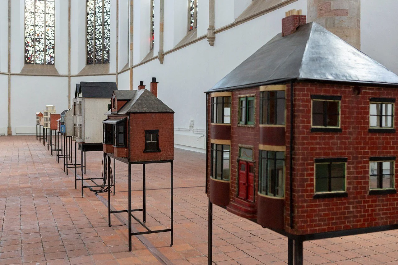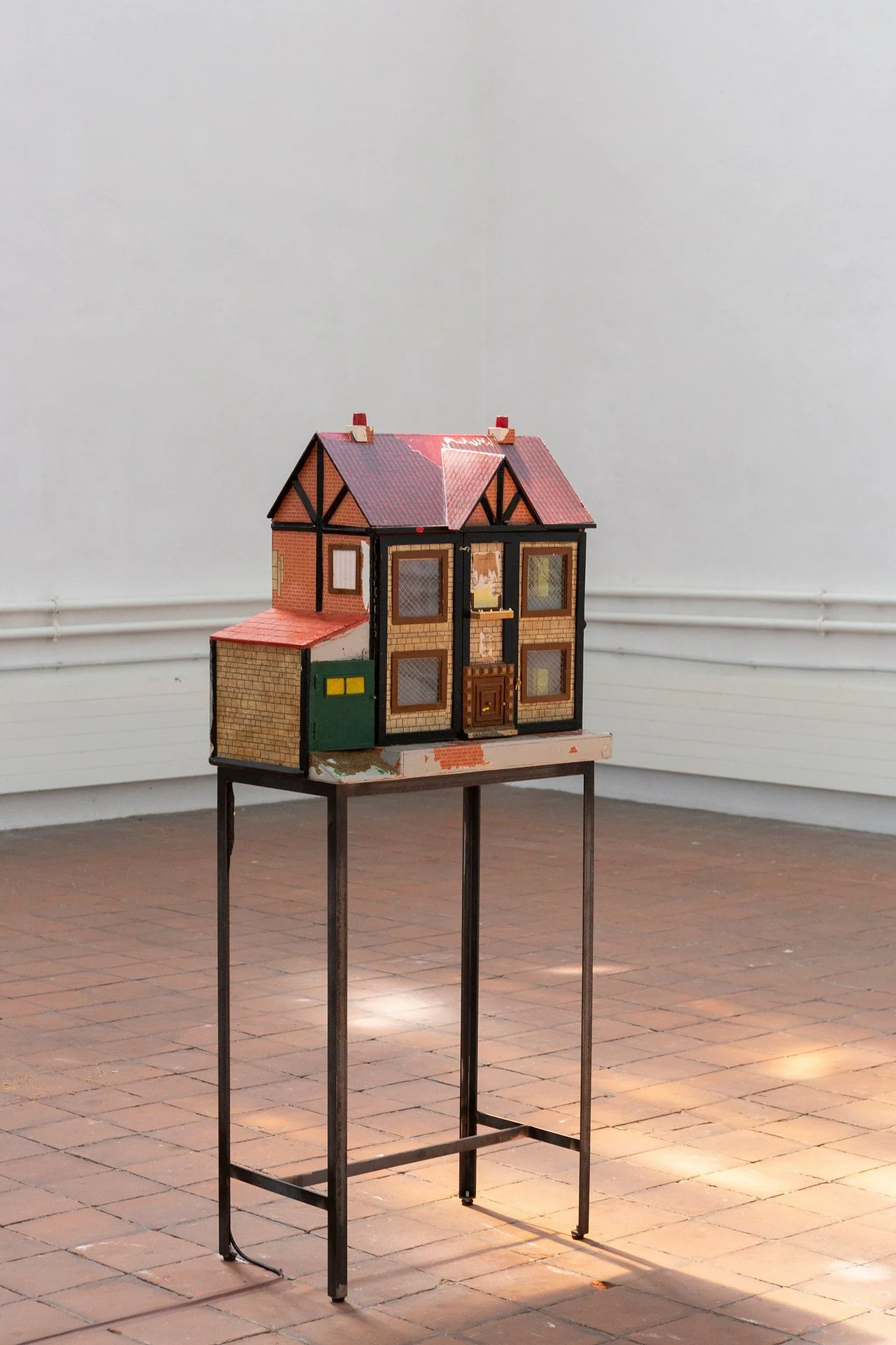 The exhibition combines a multi-channel sound work with fifteen found dollhouses representing various domestic architectural styles. Sourced in the UK, the houses date from the late 19th century to the present day. Inside represents the artists’ investigation into the relationship between architecture and identity construction, particularly the bourgeois house as a symbol of gendered behaviour, political power and civic duty.