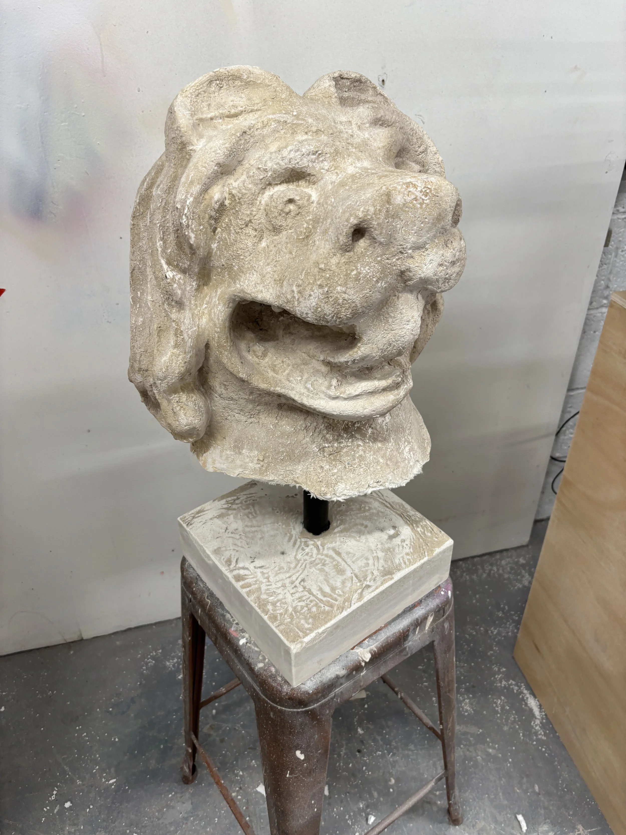 recasting a baroque c17th lions head for artist Rebecca Moss , originally this mould was taken from a listed building in Somerset. We cast this surreal looking lions head using the original mould supplied, with a jesmonite and sand mix, on a welded mild steel base